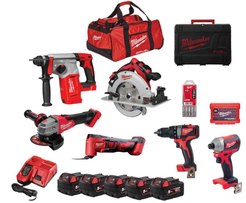 Набір інструментів акумуляторних MILWAUKEE, M18 FPP6E-505B (5 акумуляторів M18 B5 5 Аг, зарядний пристрій M12-18 FC, дриль-шуруп